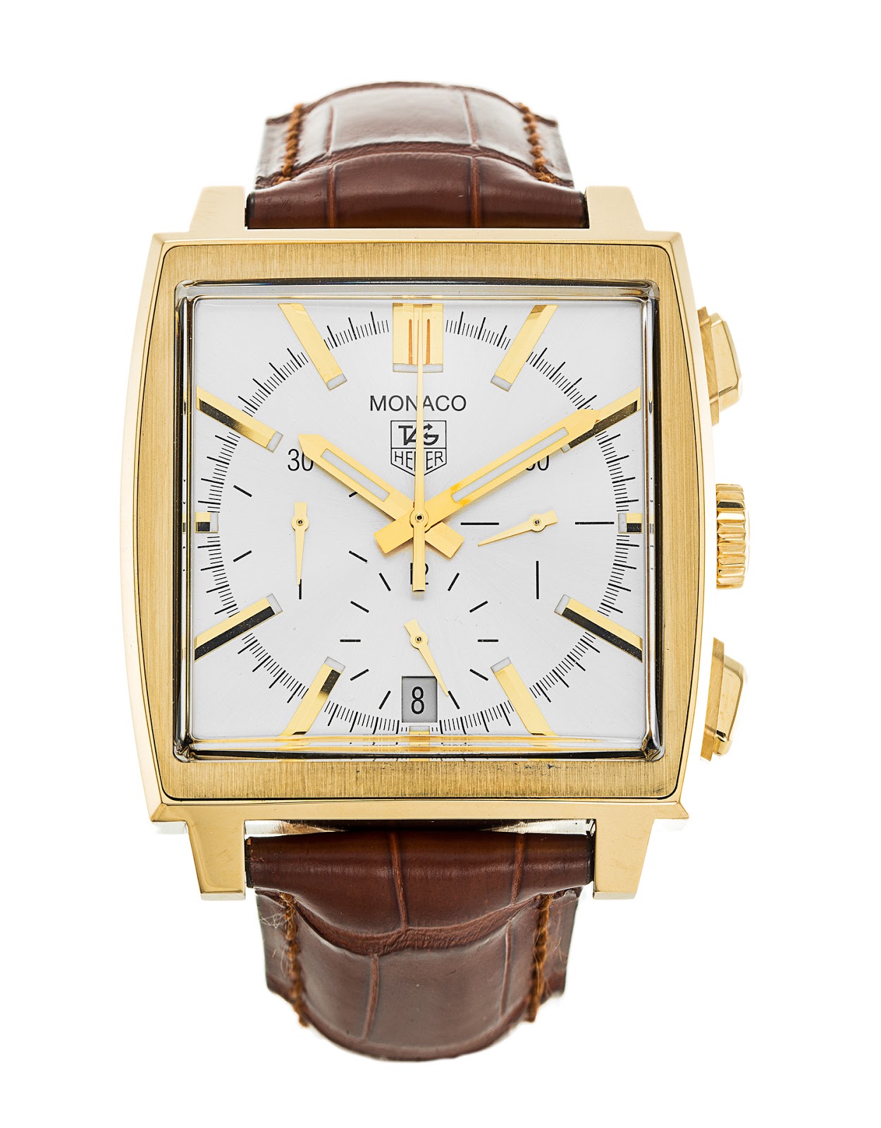 This particular Monaco measures 38mm square and 13mm thick, it contains a chronometer certified Calibre 17 movement and while I didn't catch the exact price, I know it was somewhere north of £11,000 (although I believe they might be willing to move a little bit on that if you are genuinely interested). In this particular instance the watch is supplied on a brown leather strap with a matching gold buckle (the watch is also available with a black strap) and a silvery-white dial. The strap seems a little short to me, it fitted but there wasn't much left over (my wrist is a little above average at 7.3/4") so if you have bigger wrists you might need to change that out.